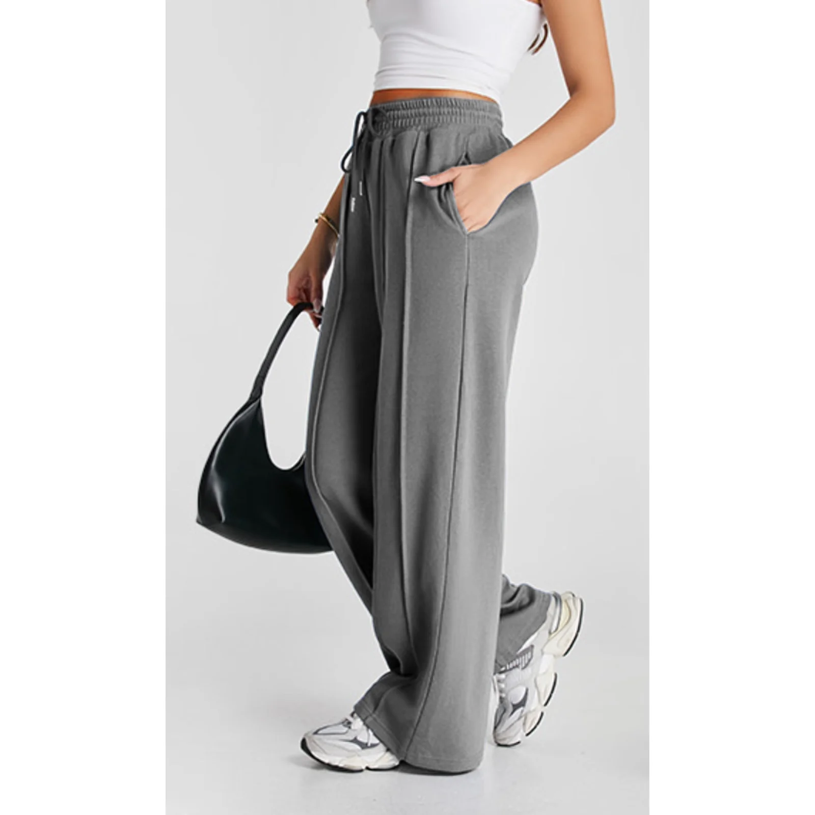 Chic Seam Design Elements: The sophisticated seams on these wide-leg jogging pants, along with an adjustable drawstring, provide personalized comfort and a touch of elegance.